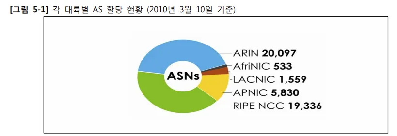 - AS는 라우팅 도메인(네트워크 도메인) 이라는 의미를 갖고 있지만, 인터넷 상에서 구분되는 도메인이라는 뜻은 특정 정책이 영향을 미치는 논리적인 범위이므로 KT, Dacom, 대기업의 망과 같은 인터넷에 연결된 조직들을 의미