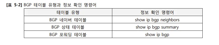 - BGP는 TCP 연결을 실시하여 네이버를 성립한 후, 네이버와의 상태 정보를 관리하기 위한 네이버 테이블과 상태 테이블을 구성한다.
